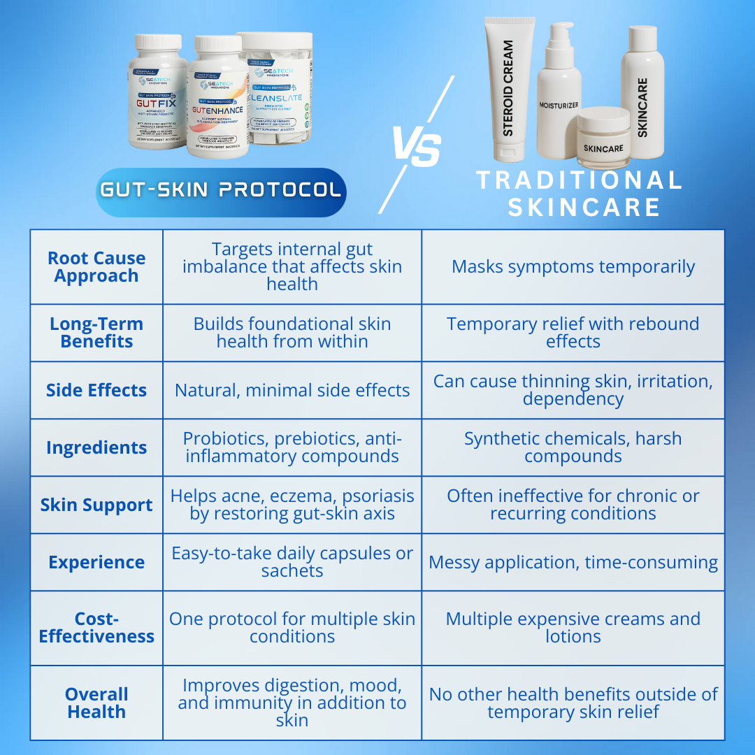 New research continues to reveal that many stubborn skin conditions—like acne, eczema, and psoriasis—are tied to imbalances in gut health. Rather than offering another quick fix, our 3-step system targets the root cause to help you finally break the cycle of flare-ups and endless creams. Big skincare and pharmaceutical companies typically sell products designed to provide short-term relief, so you’re forced to keep coming back. Our approach is different: we tackle the issue from within.